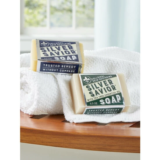 Tea tree oil has long been recognized for its antimicrobial and antiseptic properties, so we thought what better than to add it to our moisturizing Silver Savior soap. Now each bar not only contains the antibacterial power of 99.99% pure colloidal silver to help soothe dry, irritated skin but is also fortified with tea tree oil to aid in reducing inflammation and cleansing the skin of fungus and bacteria. Itβs a real boon for anyone who suffers from such chronic skin conditions as eczema, psoriasis, dermatitis, or athleteβs foot.